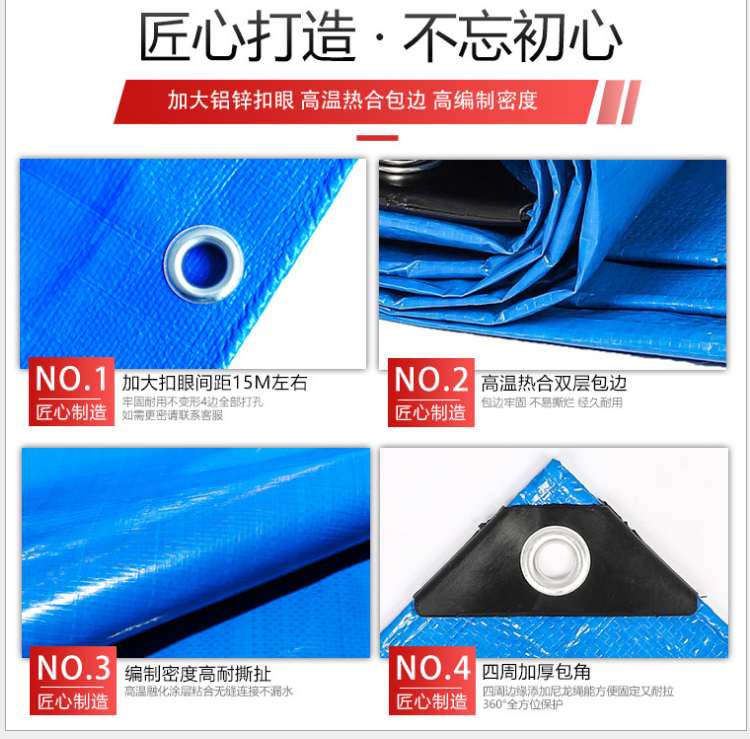 雙藍色PE防水篷布匠心打造,加大扣眼間距15m左右,高溫熱合雙層包邊,編織密度高耐撕扯,四周加厚包角